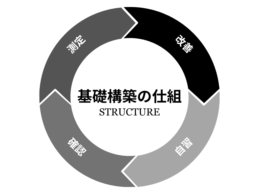 ディープルートでは、自習・確認・測定・改善の4つの工程で英会話に必要な基礎を構築します。