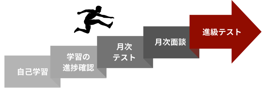 自己学習・学習の進捗確認・月次テスト・月次面談の4工程を繰り返しながら学習を積み上げ、進級テストをパスすることで、次のレベルへ進みます。